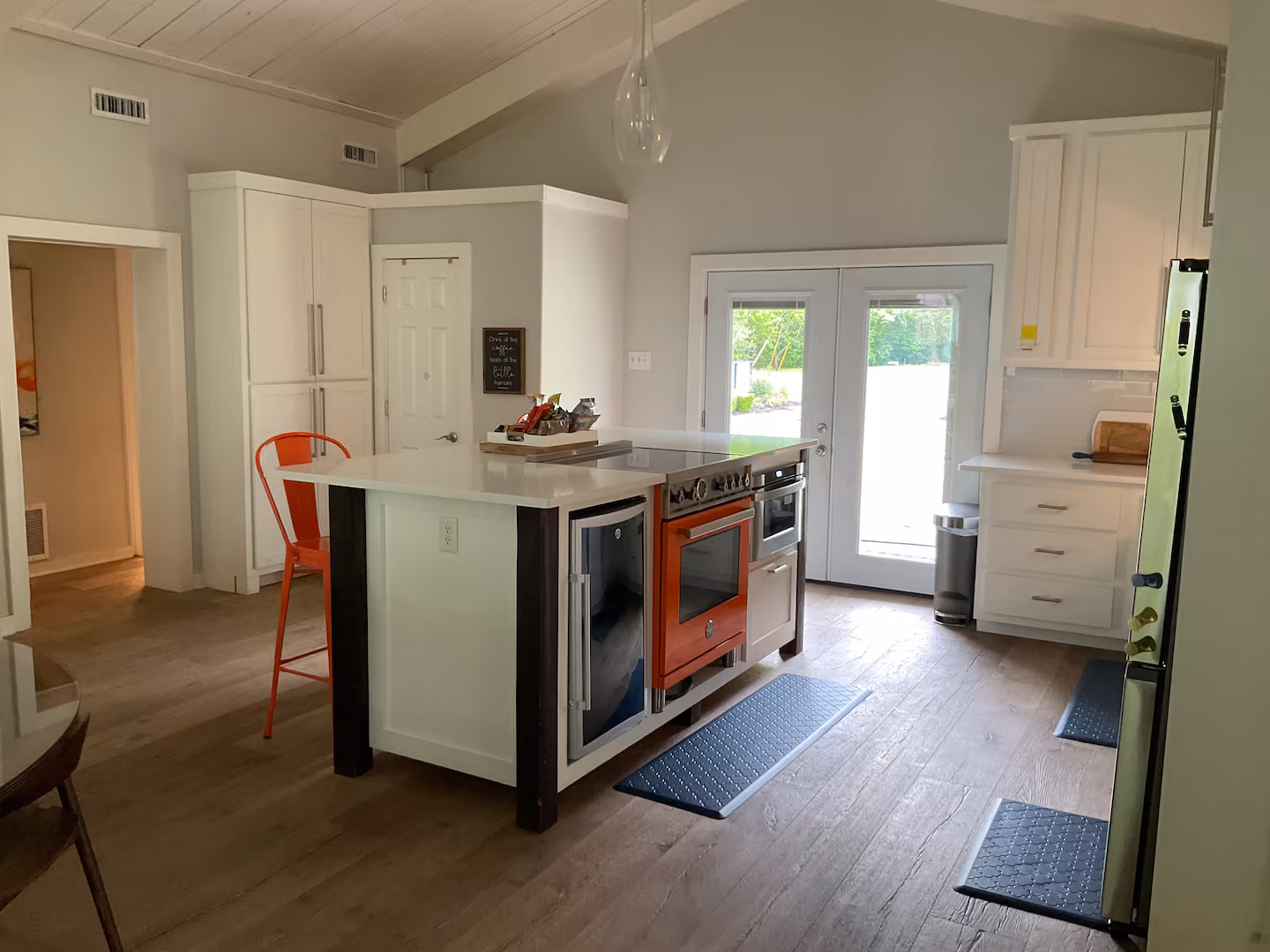 Welcome to our cozy Main House, a roomy haven featuring 2 bedrooms and 2 bathrooms. Here, you’ll find a King and Queen size bed, along with 2 futons, providing comfortable sleeping space for up to 6 people. Feel free to whip up delicious meals in the full-sized kitchen, complete with an Italian Bertazzoni induction range/stove. To make your stay even cozier, you’ll have access to 2 fireplaces – one gas and one wood-burning. Need extra sleeping space? No worries, we’ve got air mattresses available upon request.
